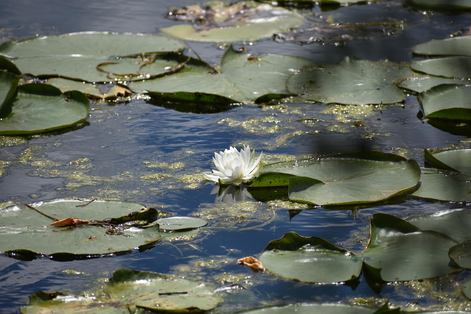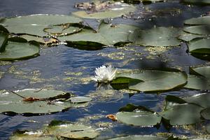 A lotus flower blooming among lily pads